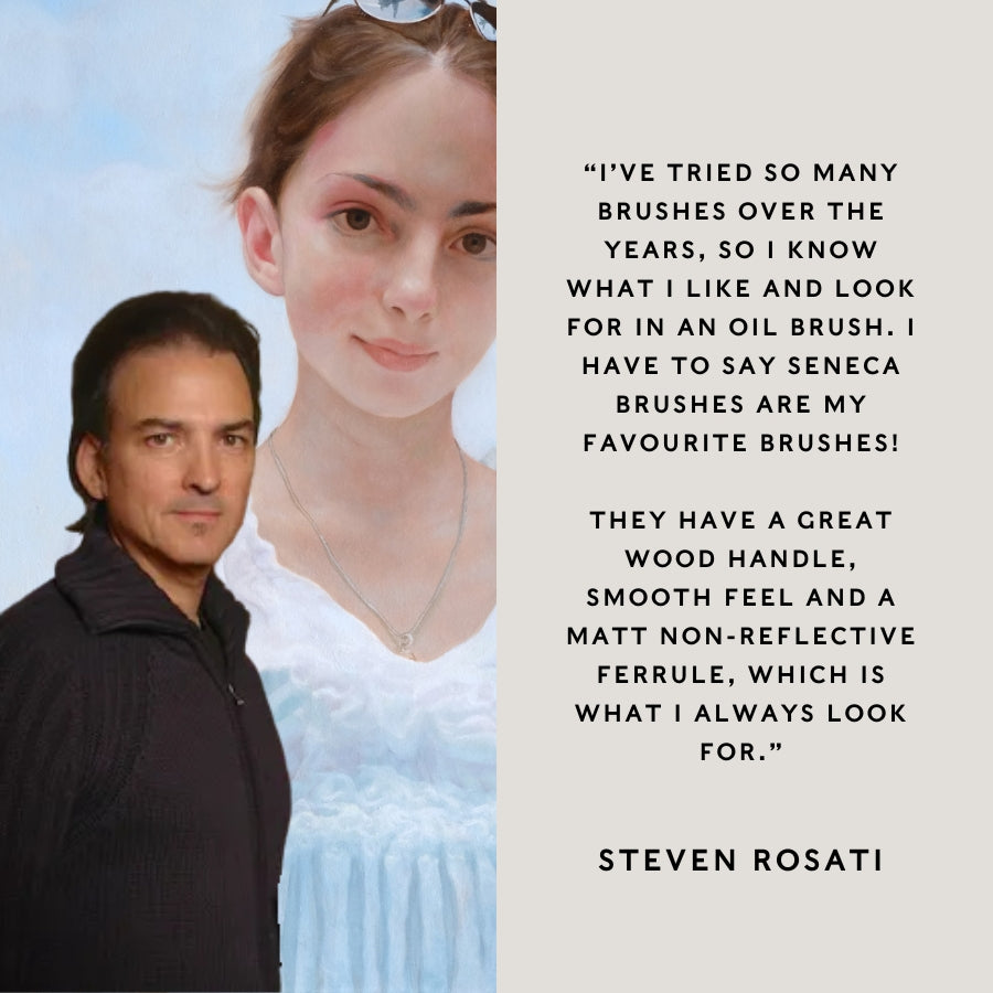 Our Seneca set curated by Steven Rosati for portrait paintings, is made with premium, interlocked synthetic bristle and offers the perfect balance of spring and snap.  Seneca paint brushes can be used with acrylic, oil and water mixable oil paints.  Seneca is interlocked and designed to ensure that the brush retains its shape for control and placement of color, releasing paint evenly from expertly tailored synthetic filaments.